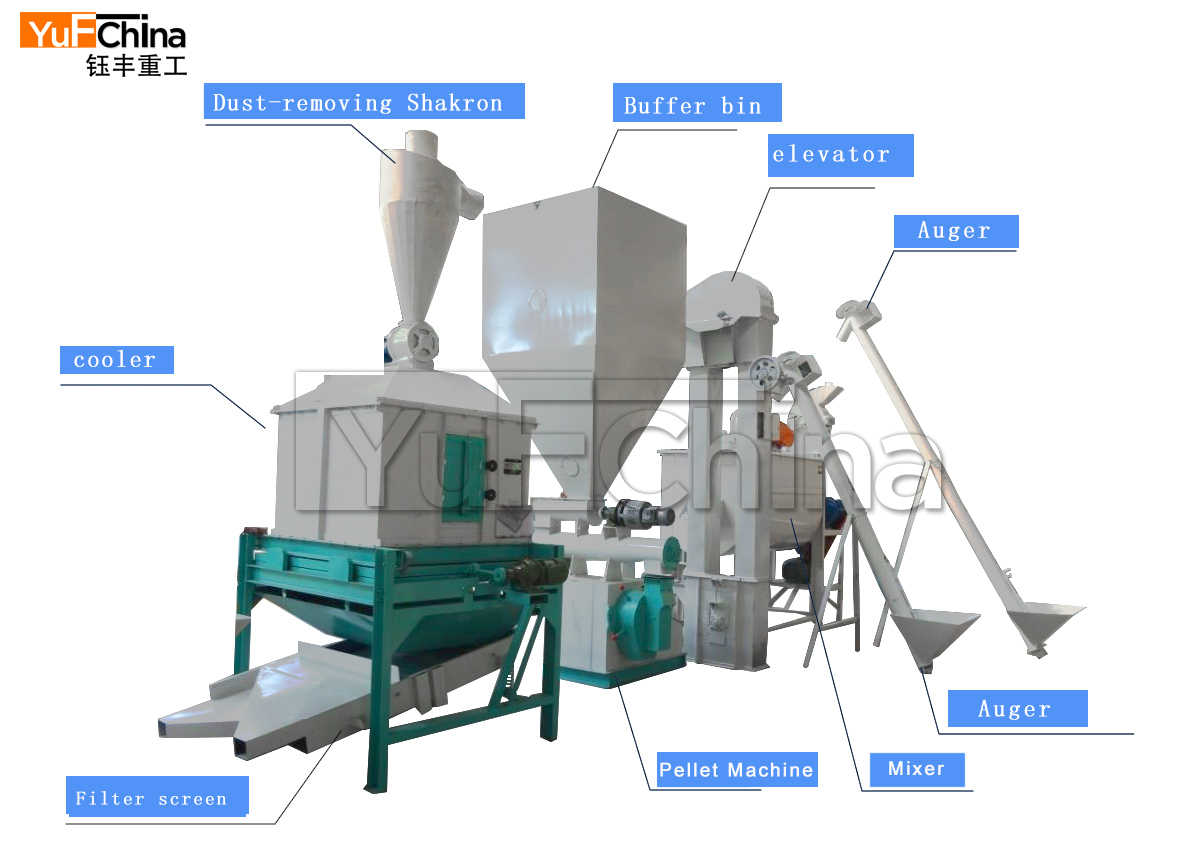 Our pellet production line is a complete production line which consists of a feed auger, a feed mixing machine, a hoist, a silo, a feed pellet machine, a countercurrent cooler, a cyclone, a finished filter screen, and so on.